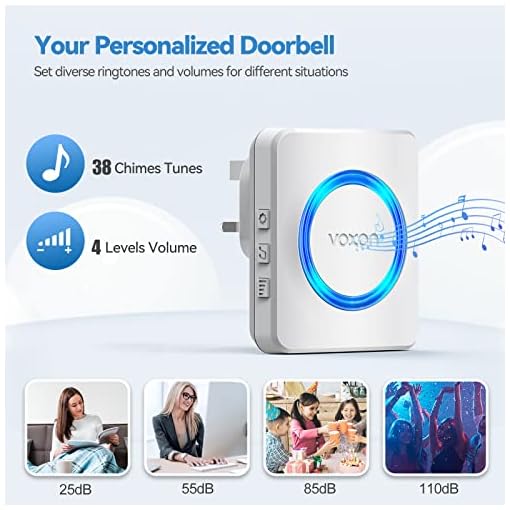 Wireless Doorbell, VOXON Waterproof Door Bell Wireless Loud Chime Kit Plug in Cordless Doorbells Battery Operating at 400m Range, IP65, 3 Working Modes, 38 Chimes & 5-Level Volume