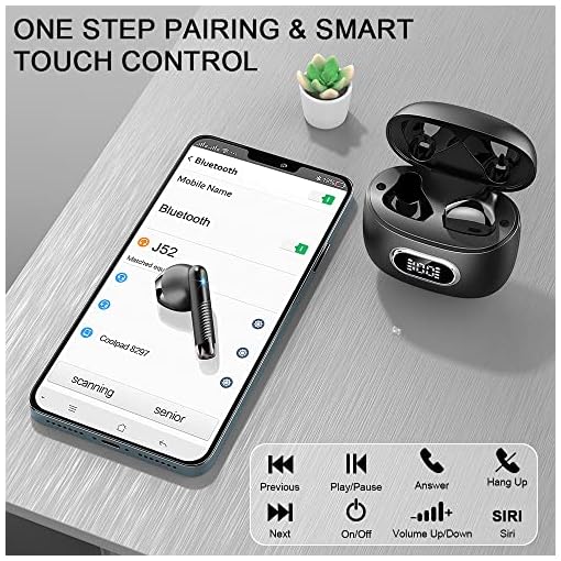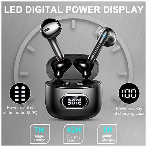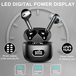 42 Hours Playtime and LED Power Display: In ear headphones work for 7 hours on a single charge, up to 42 hours with a charging box. With fast charging Type-C interface, the wireless earbuds bluetooth be fully charged only need 1 hours. Features with smart LED digital display, you can easily know the battery consumption on both bluetooth headphones in ear and the charging case so you can master the time to charge it. The powerful battery allow for all day listening.