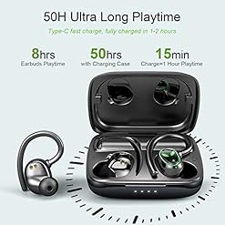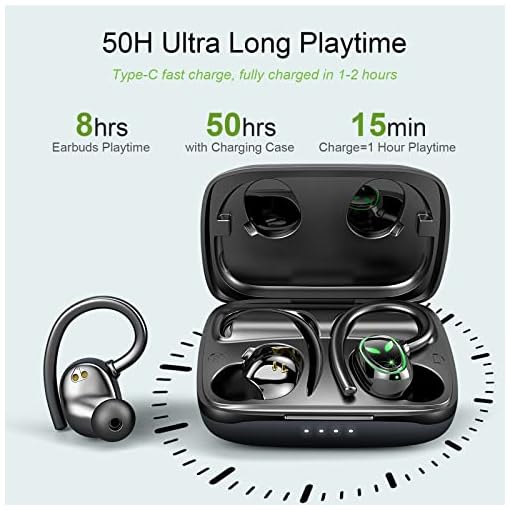 50 Hrs of Play Time: True wireless earbuds can last for over 8 hours playtime from a single charge. The portable charging case can charge the twin sports earbuds for 6 times, and then you will get total 50hrs playing music. The Type-C fast charging cable charges the charging case in just 1.5 hours. So you ever worry about the battery life of headphones with microphone even on long trips. (Note: Please fully charge in ear headphones for the first use.)